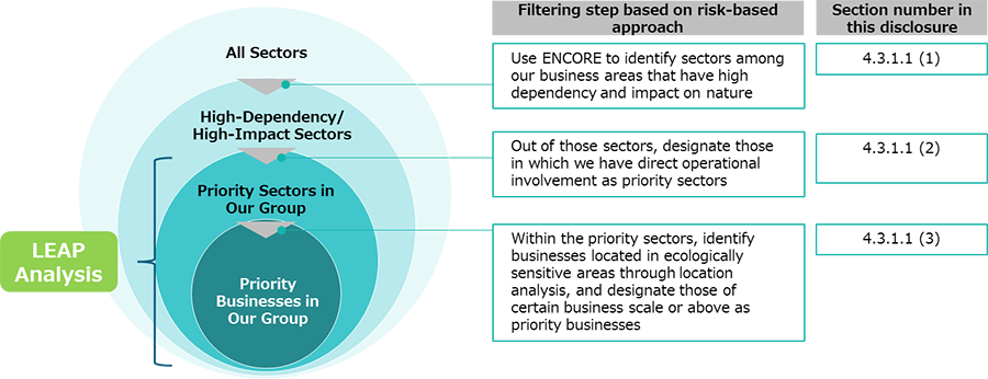 Since FY2024, we have initiated a risk-based approach that takes a cross-organizational view of the Group’s businesses, including the supply chain, to identify those with high levels of dependence and impact on natural capital, and to manage and address them on a priority basis. The entire supply chain is broadly categorized into our Group companies’ operational sites (direct operations) and other parts of the supply chain. We are identifying priority businesses as well as identifying and assessing nature-related risks and opportunities for each category.