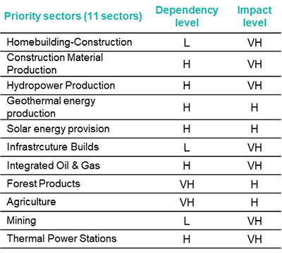 Selection of high-dependency, high-impact sectors through analysis of general dependency and impact factors related to natural capital