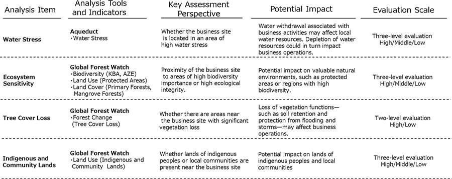 Given the diverse nature of our Group’s existing businesses, the degree of dependence and impact on natural capital varies by business sector and region. While we have traditionally addressed these different features through individual initiatives tailored to each business, we believe that, in order to promote our medium-term goal to “Accelerate initiatives toward a nature-positive world by 2030,” it is also necessary to organize and assess risks and impacts from a company-wide perspective and to consider appropriate measures accordingly.