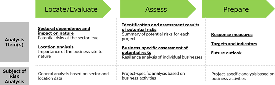 Note:Nature-related risks and opportunities include those related to climate change; however, our company has already conducted and disclosed climate-related risk and opportunity analyses for 22 businesses across six sectors in accordance with the Task Force on Climate-related Financial Disclosures (TCFD). Therefore, under the TNFD framework, our analysis and disclosure of nature-related risks and opportunities focus on factors other than climate change, such as water and ecosystems. For information on climate-related risks and opportunities, please refer to our Climate Change page.
