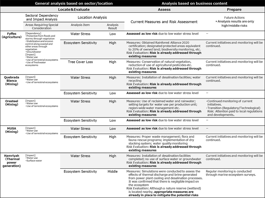 Additionally, in FY2024, to strengthen our risk-based approach, we began conducting new risk analyses based on natural capital. These analyses identify high-risk businesses and supply chains within the Sumitomo Corporation Group, assessing current and future risks through scenario analysis and deciding on measures to address those risks. For high-risk businesses, we have already identified priority sectors and operations requiring action and conducted risk analyses for five businesses. As a result, we confirmed that measures such as implementing environmental impact assessments, reducing freshwater intake through seawater desalination, and carrying out conservation activities are already in place to lessen impacts on natural capital. For supply chains, we have begun identifying priority supply chains by weighing factors such as whether they handle commodities with a high impact on nature. (Please refer to the “4. Risk & impact management” section below for details.)