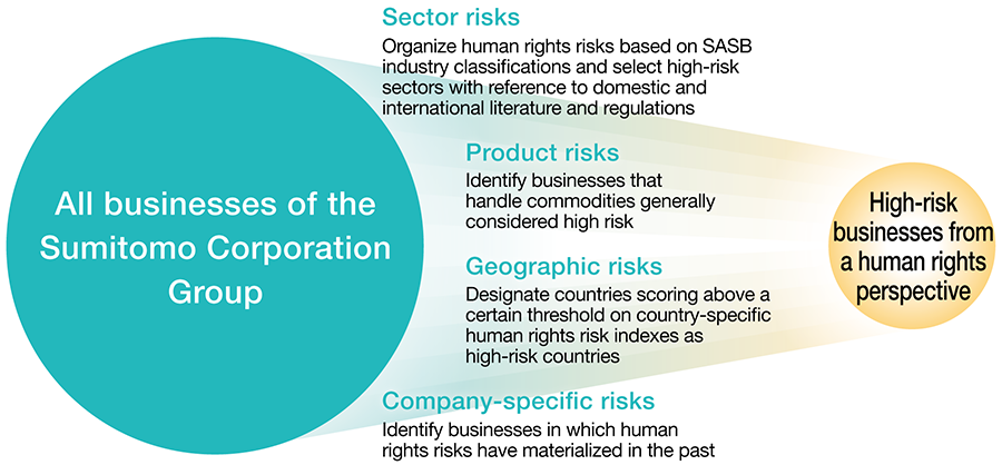 In accordance with the Sumitomo Corporation Group Human Rights Policy, Sumitomo Corporation began human rights due diligence in 2020 to identify, prevent, and address any adverse human rights impact that the Group business activities may cause or contribute to. In FY2020, as the first step, we worked to identify salient human rights issues that required prioritized action, based on a comprehensive assessment of potential human rights impacts across the Group. From FY2021 to FY2024, we conducted human rights due diligence across all businesses with the support of outside experts, identifying and assessing human rights risks.