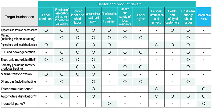 In organizing the risks associated with each sector and product, we expanded our group’s eight salient human rights issues by adding two additional items—“Customer health and safety” and “Upstream supply chain issues”—bringing the total to ten. These were then combined with geographic risk factors to develop a comprehensive mapping, which was organized as follows.