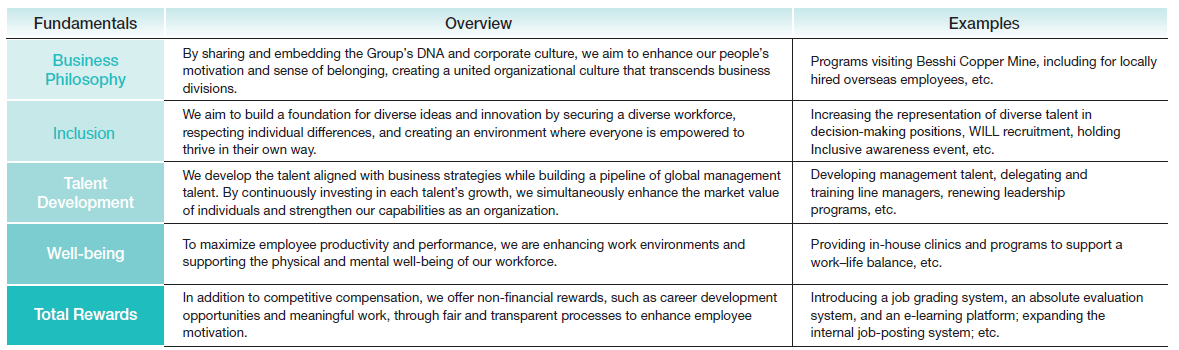 Sumitomo Corporation established the Sumitomo Corporation Group "Global HR Management Policy". This policy sets forth the vision and concept of talent management on a global basis with the aim of achieving talent management for the creation of new value. It is used as the foundation for each HR initiative.