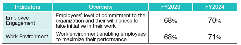 We monitor the scores for “Employee Engagement Index” and “Work Environment Index” as indicators to verify whether our initiatives for people and our organization are producing the intended effects. Currently, our scores are on par with the global average, and we aim to maintain or improve this level.