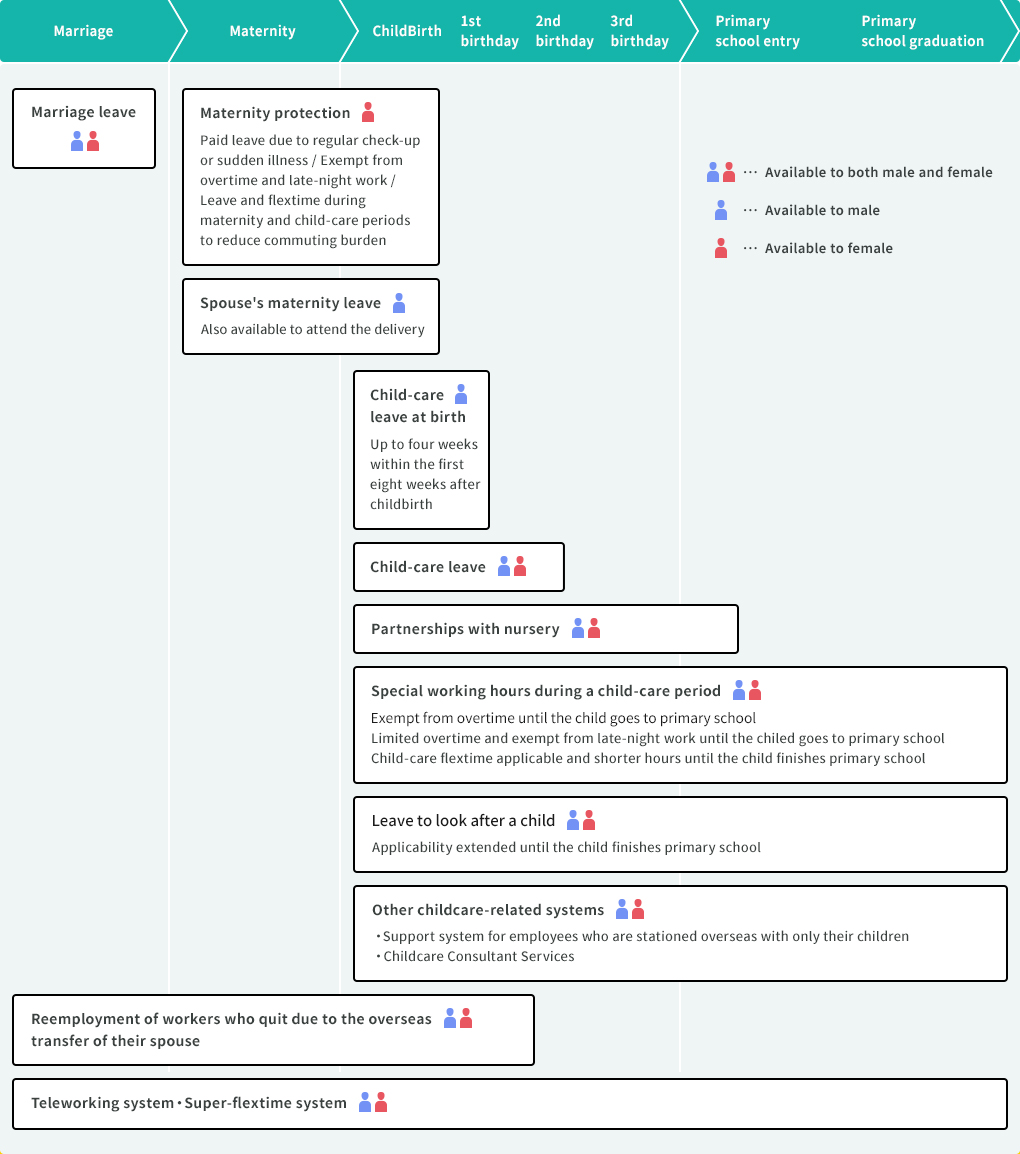 In addition, in order to support our employees to balance life events and career development, we have reinforced tangible aspects including the establishment of internal policies that go beyond regulatory requirements and have addressed the intangible elements such as correcting long working hours, encouraging employees to take paid leave, and reforming employee awareness with the aim of creating an environment that facilitates active participation in the company after childbirth and childcare.