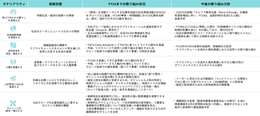 住友の事業精神、住友商事グループの経営理念を踏まえ2017年に『マテリアリティ』を特定し、2024年には社会課題の一層の深刻化や当社グループの強み、ステークホルダーからの期待も踏まえ、改めて価値創造の観点から社内外のステークホルダーと約1年にわたり議論を行い、経営会議、取締役会での承認を経て、更新しました。